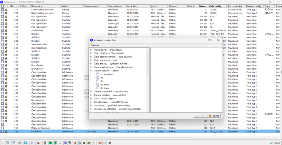 Ukázka databáze a filtrů svislých značek: