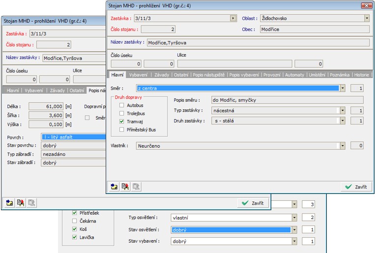 Systém dále umožňuje evidovat v mapovém prostředí umístění dalších bodových objektů (např. výhybek, křižovatek a vložených bodů) a liniových objektů popisujících trasy MHD, včetně správy příslušných informačních databází.