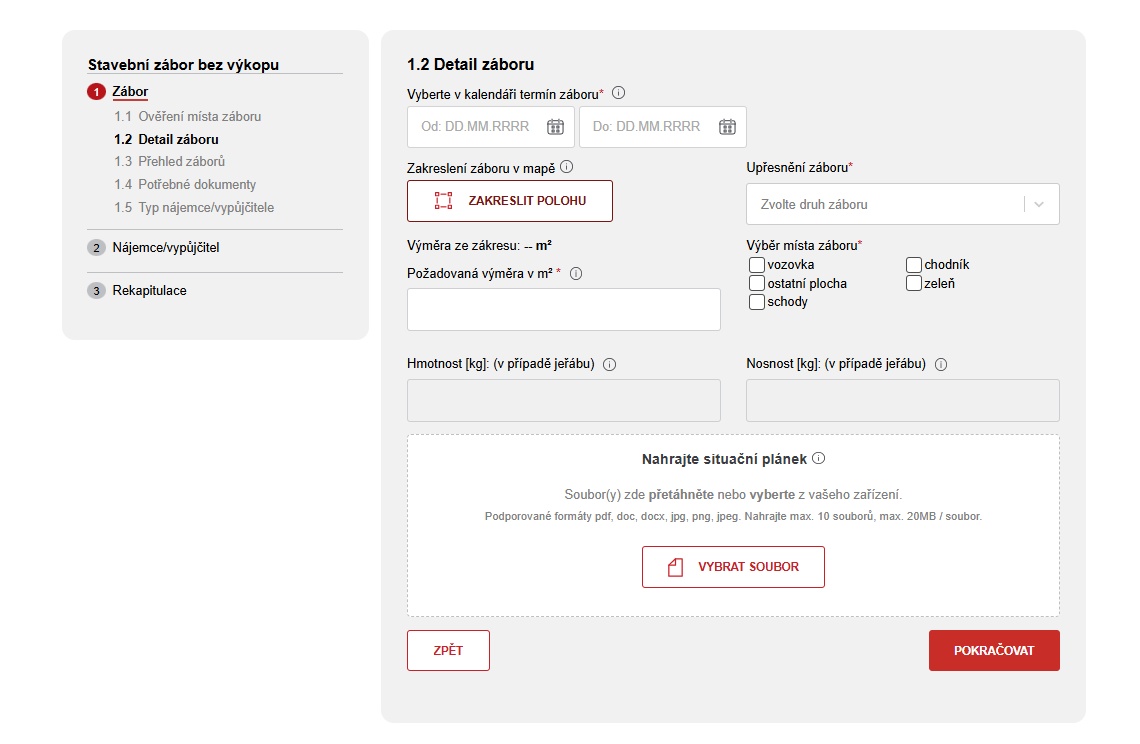 REGIOP umožňuje podání žádostí pro stavební zábory (s výkopem i bez výkopu) i nestavební zábory, například restaurační předzahrádky, stánky, filmová natáčení, kulturní, sportovní nebo reklamní akce. Součástí aplikace je zákres záboru přímo do mapy, přikládání situačních plánů a další povinné dokumentace.
