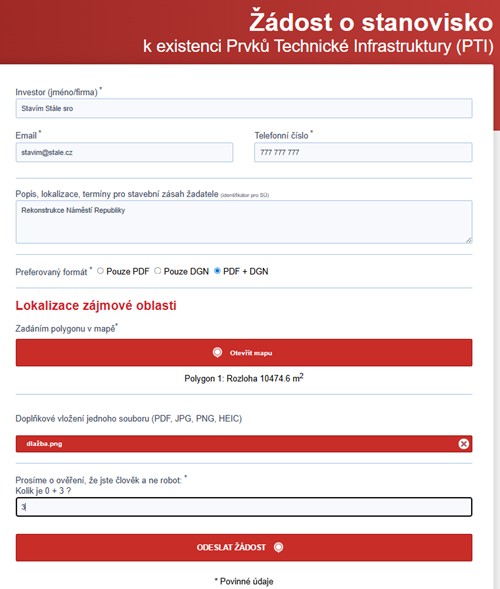 Webová aplikace / formulář slouží stavebníkům a dalším uživatelům k odeslání žádosti o vyjádření k existenci inženýrských sítí a dalších prvků technické infrastruktury v majetku daného správce v požadované lokalitě.